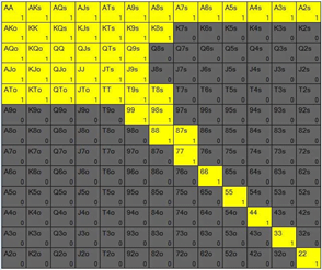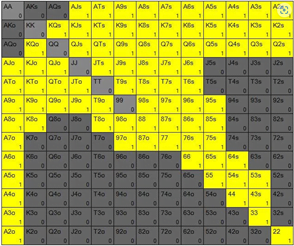 Hand ทั้งหมดที่คุณสามารถนำมา Open-raise ในสถานการณ์นี้ และ มีผู้เล่นที่ Call จากตำแหน่ง Big blind ที่มี Range ในการ Call ที่ Big blind อยู่ที่ 42% ของ Hands ดังภาพด้านล่าง