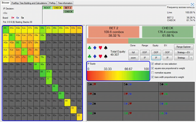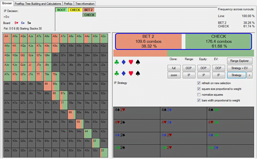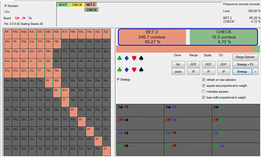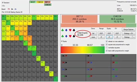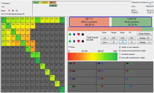 จะเห็นได้ว่า Piosolver เลือกที่จะ bet 86.28% และ check 13.72% ดังในกรอบสีน้ำเงิน