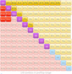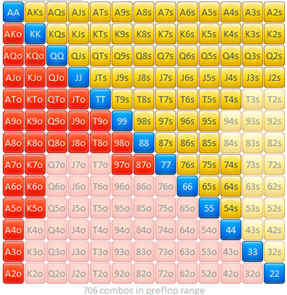 แตกต่างจากที่ตำแหน่ง Button ที่สามารถ Open-Raise 53% ของ Hand จาก Range